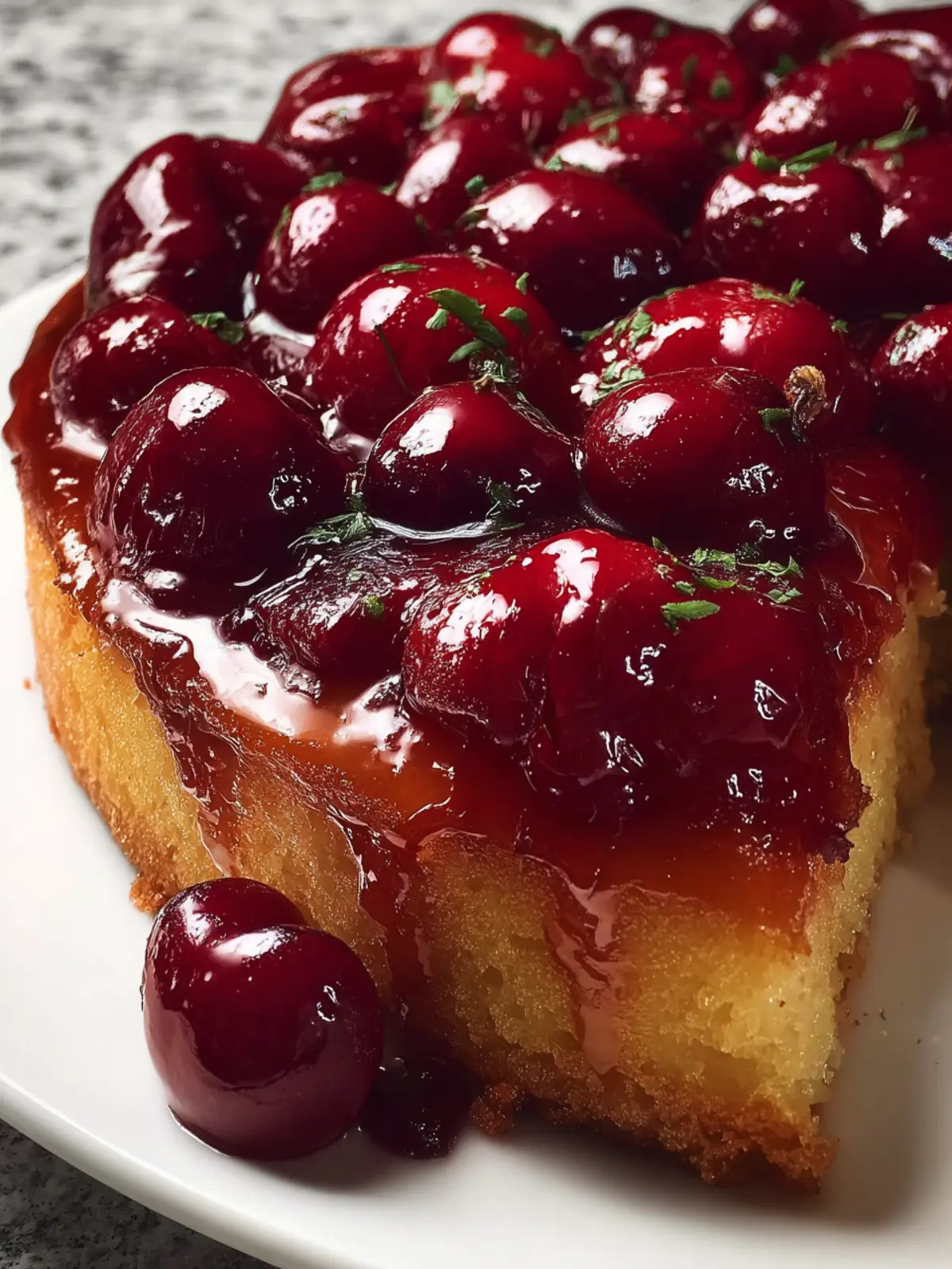A delicious cherry upside-down cake featuring a caramel topping and a moist cake base.