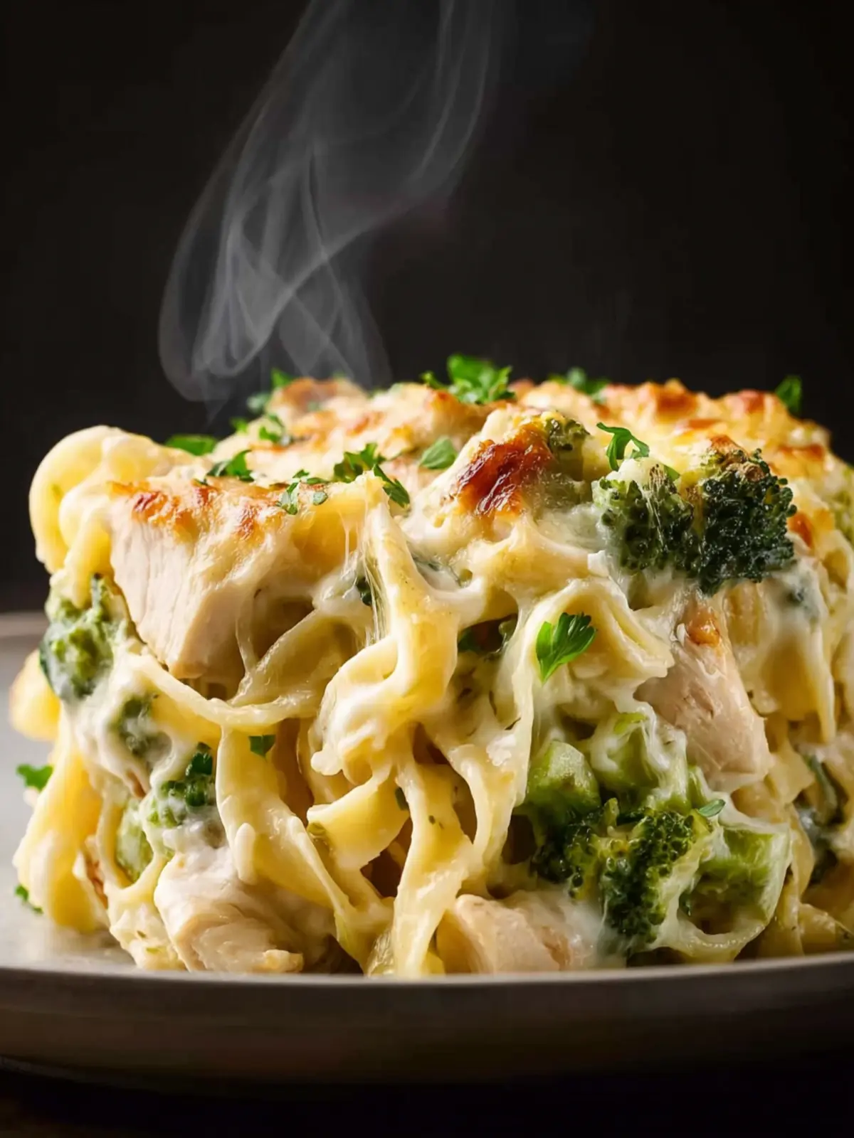 A delicious and creamy pasta bake loaded with chicken, broccoli, and cheeses.