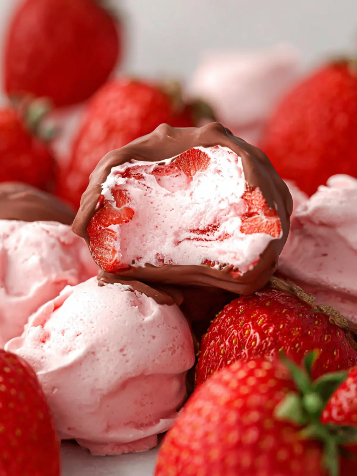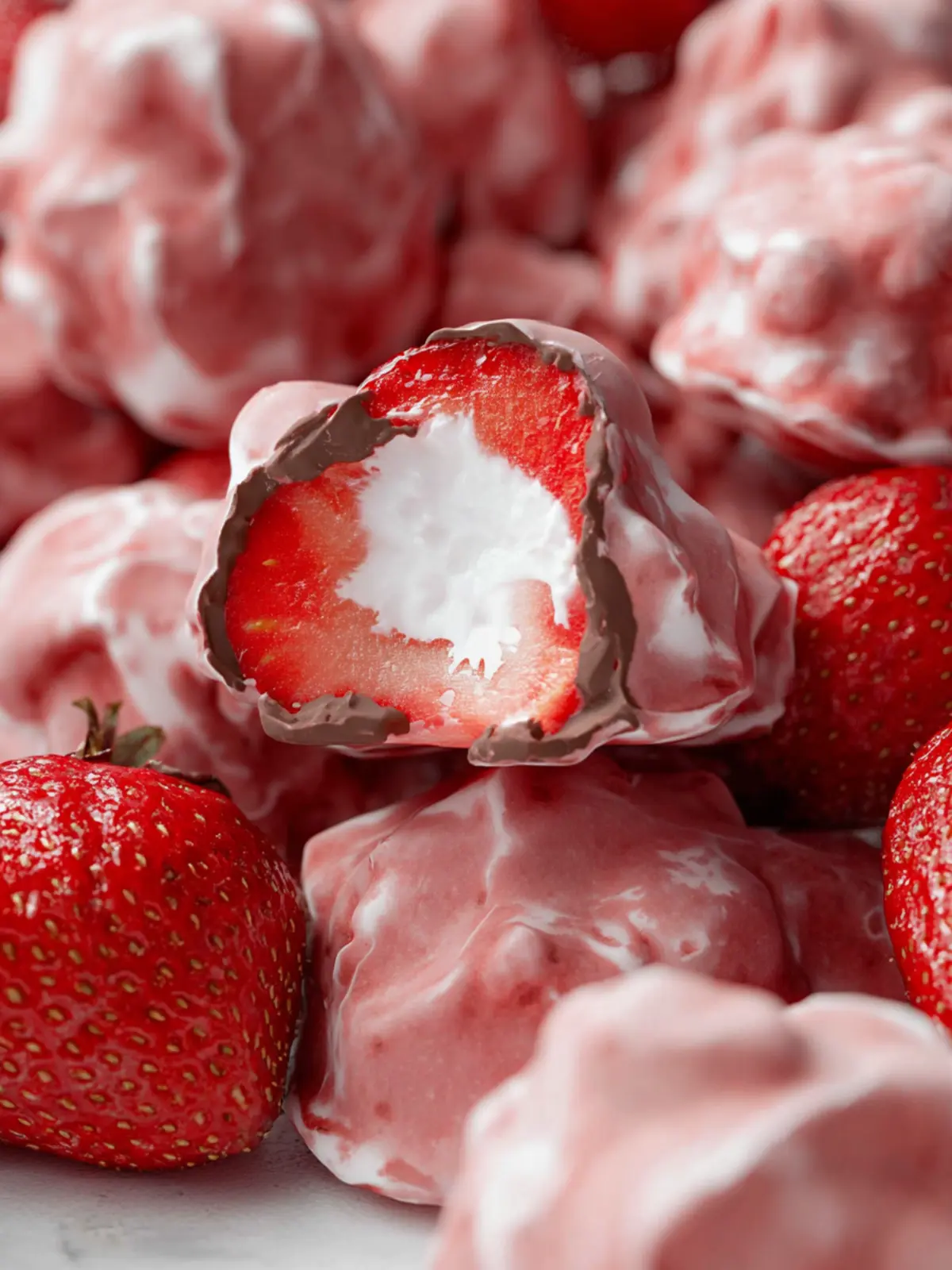 Delicious chocolate covered yogurt clusters with strawberries and Greek yogurt.