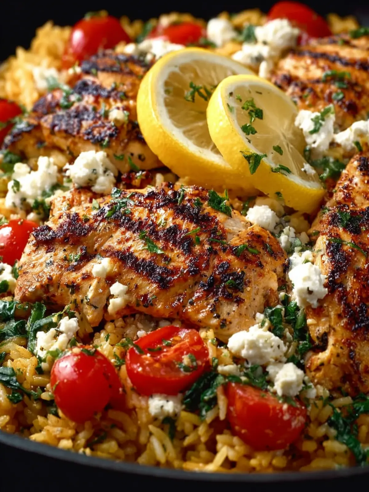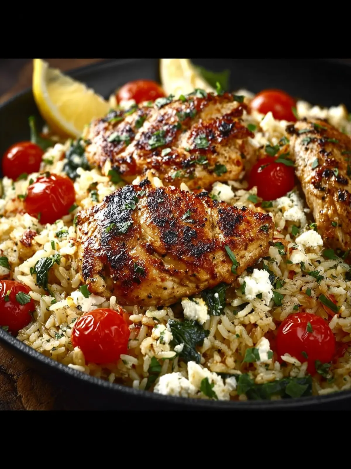 A flavorful lemon chicken dish served on a bed of chickpea rice with fresh spinach and feta.