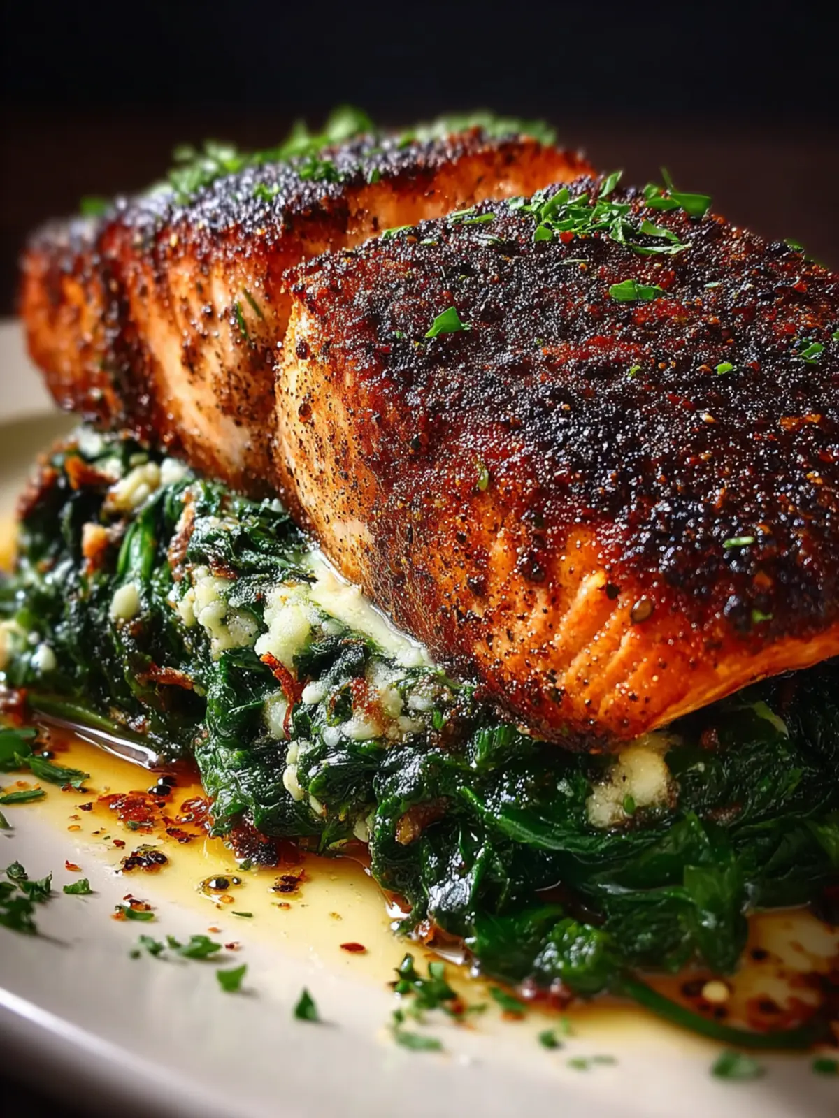 A delicious blackened salmon fillet topped with a creamy spinach and cheese filling.
