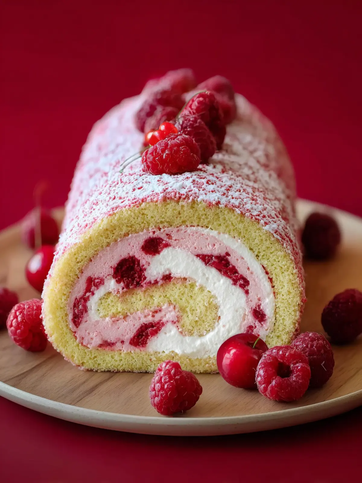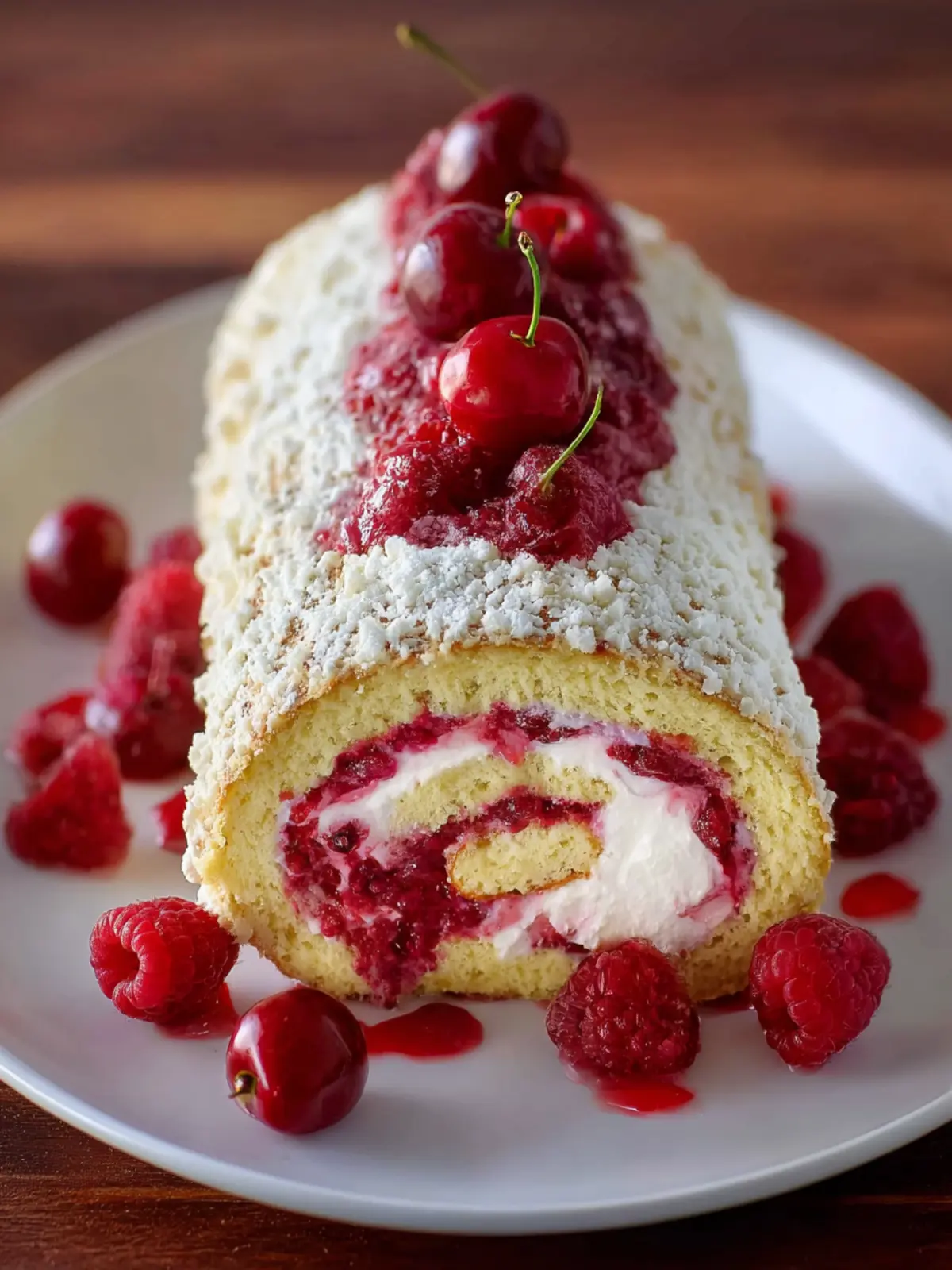 A delightful cherry roll cake filled with creamy filling and topped with a cherry sauce.