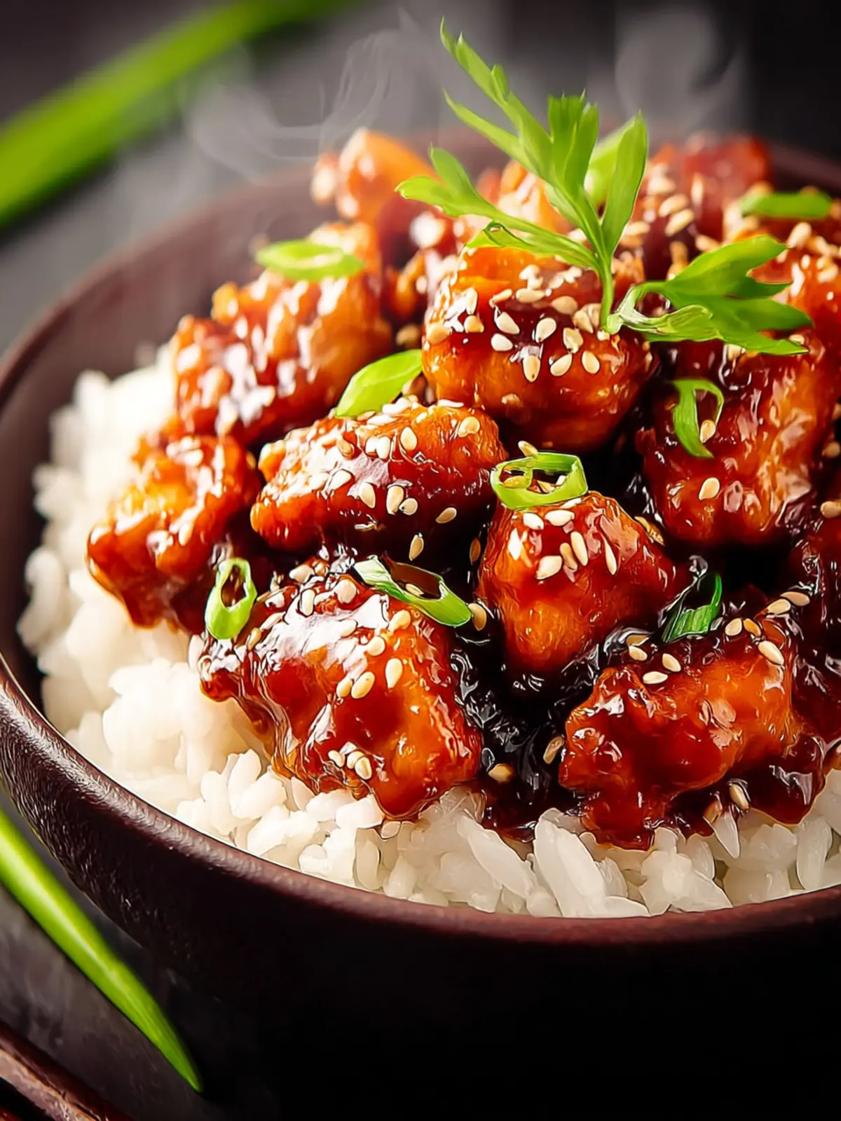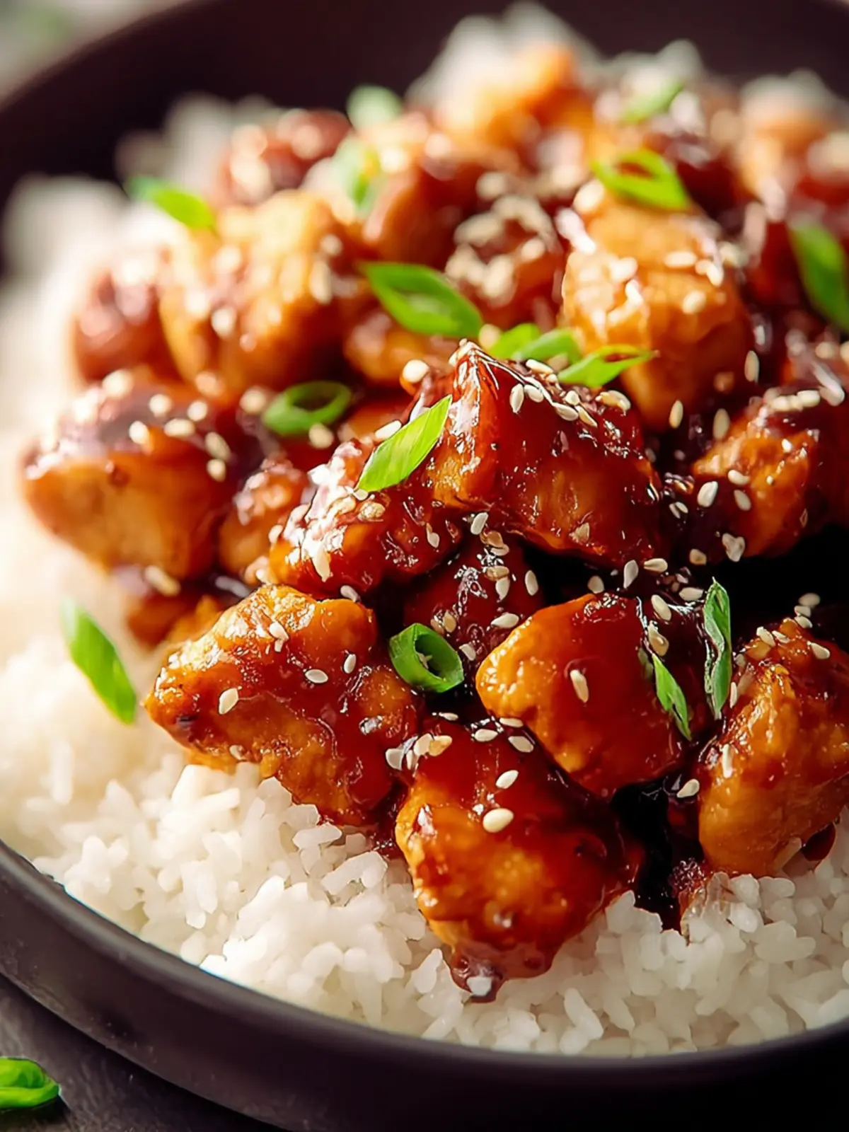 Finish off your plate by garnishing with chopped green onions and a sprinkle of sesame seeds. This not only brings visual appeal but also adds a fresh crunch and nutty flavor that complements the bourbon chicken beautifully.