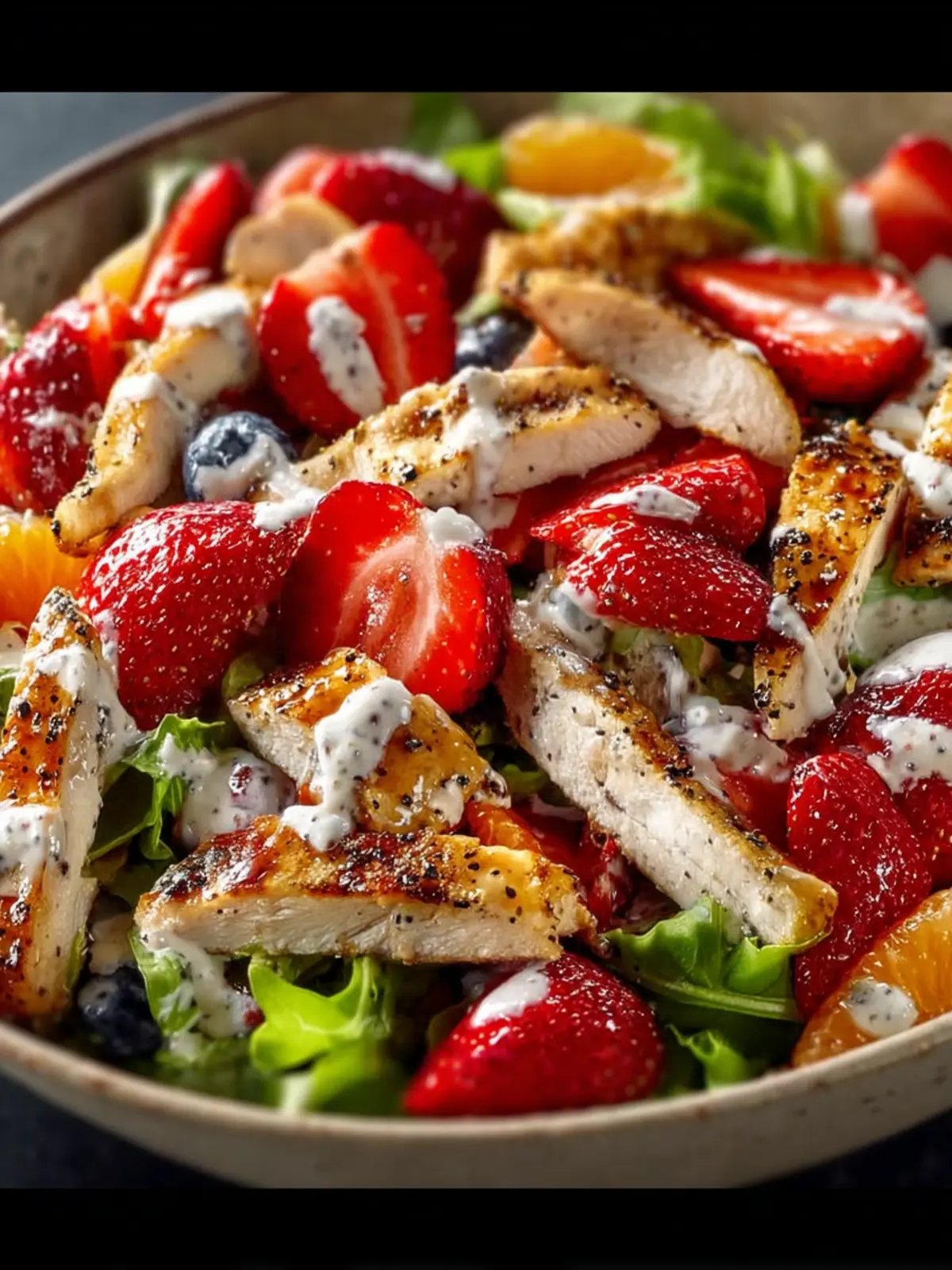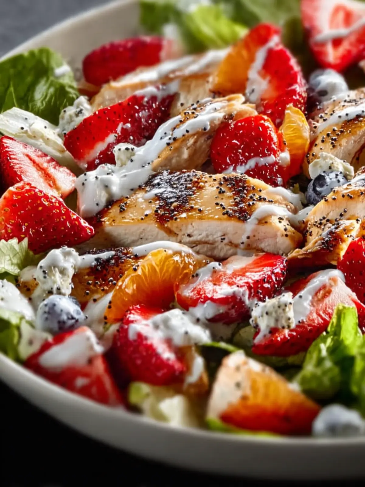 A refreshing salad with a mix of fruits and grilled chicken, topped with poppyseed dressing.