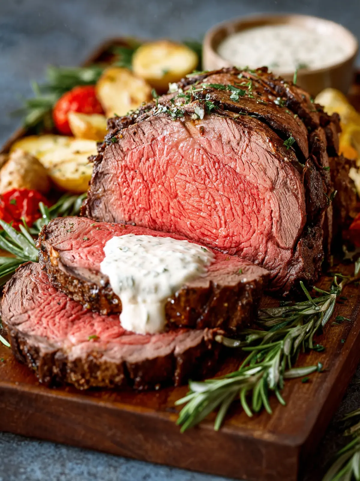 - Slice the beef against the grain, drizzle with horseradish sauce, and garnish with chives or parsley.