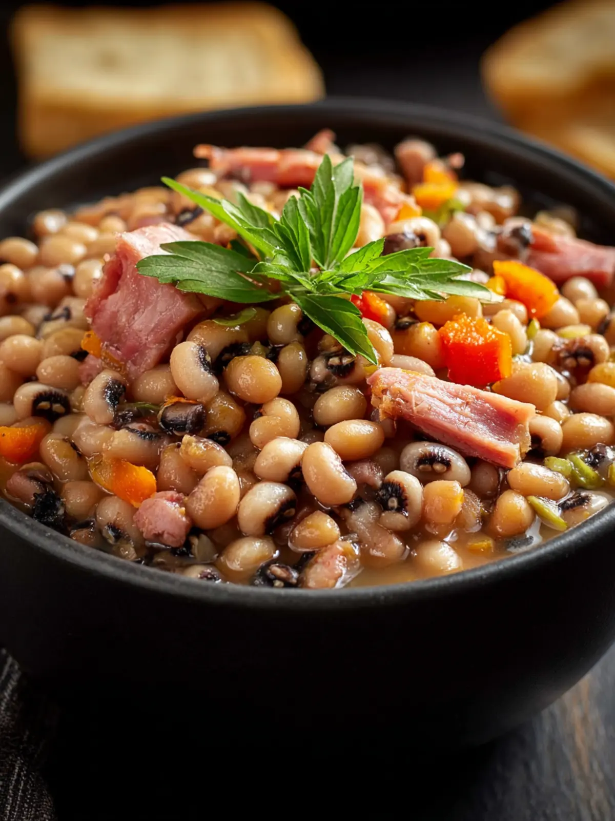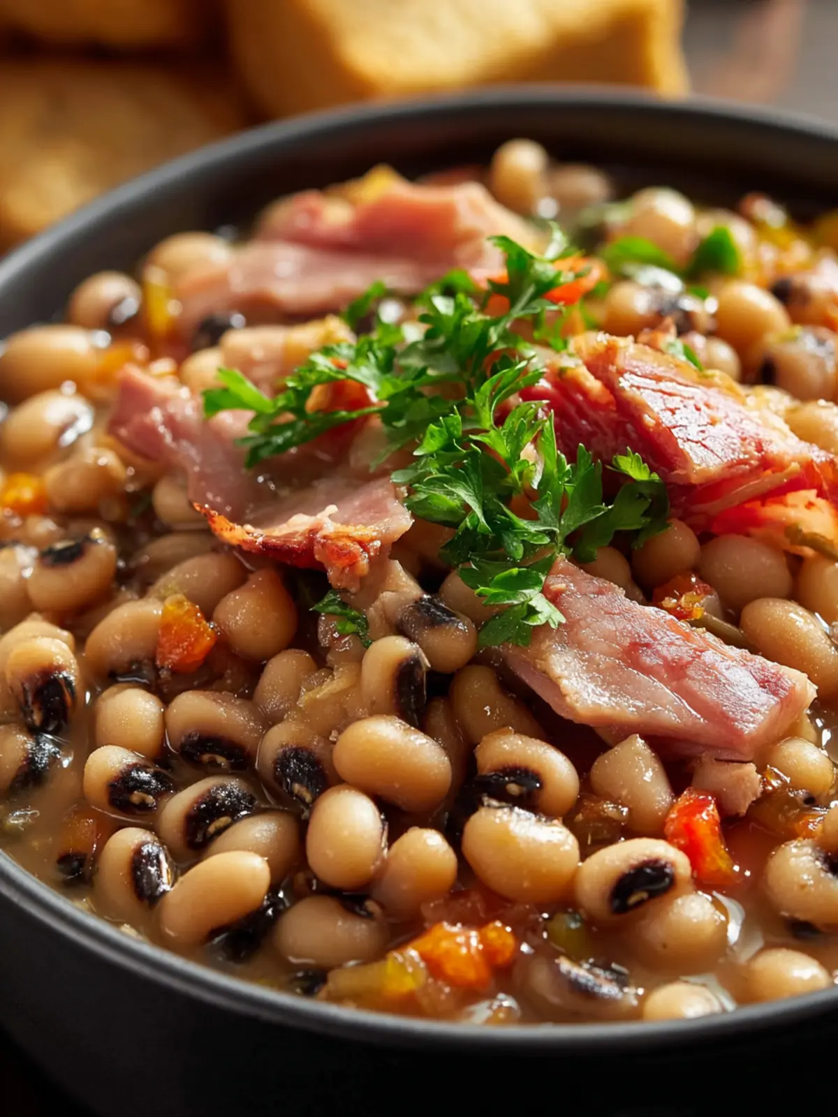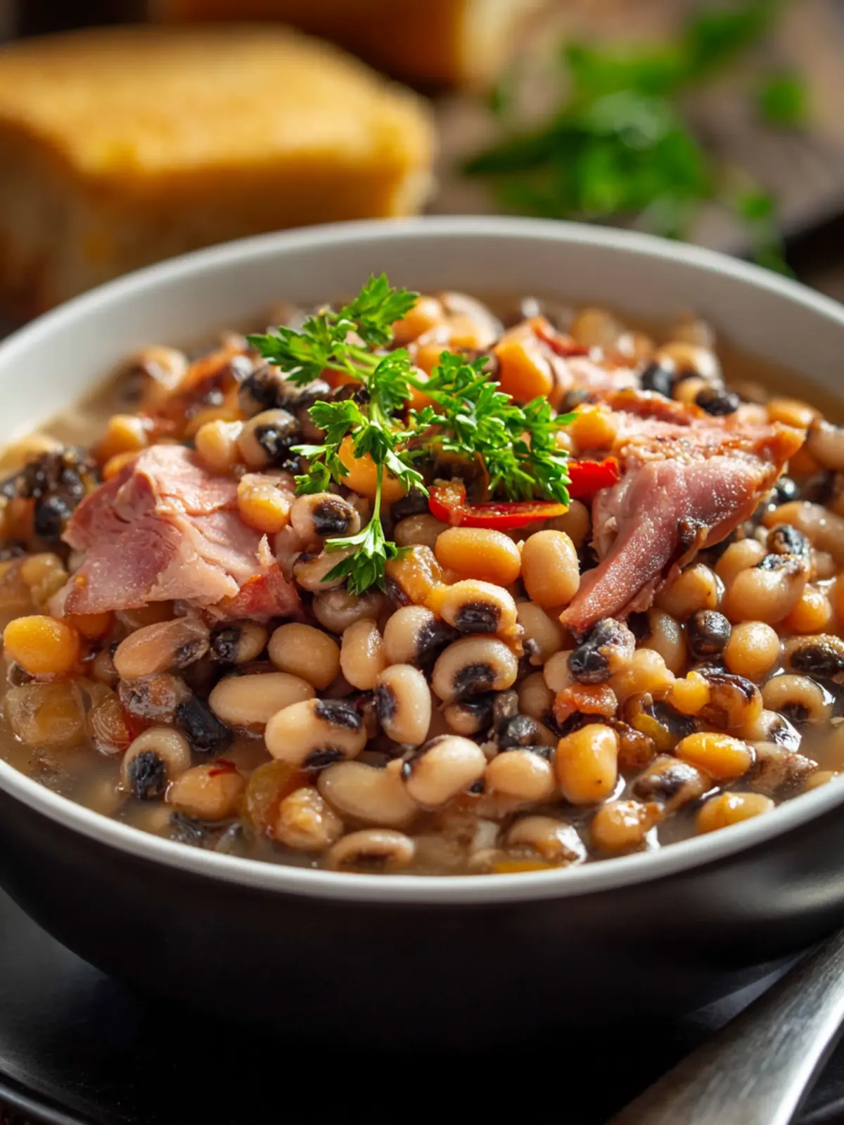 A comforting dish of black-eyed peas cooked with a smoked ham hock, perfect for a hearty meal.