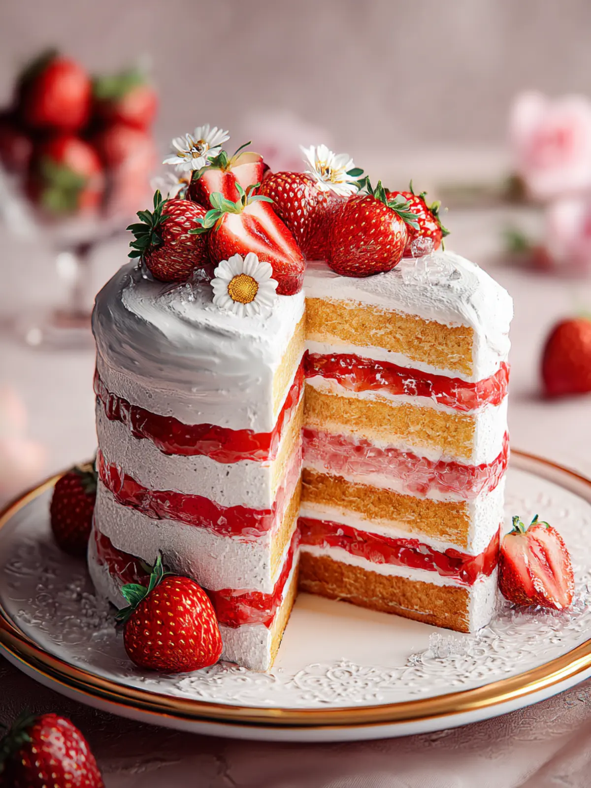 • Fresh Strawberries: Garnish each slice with a sprinkle of sliced fresh strawberries. The vibrant color and natural sweetness enhance the cake’s flavors beautifully.
