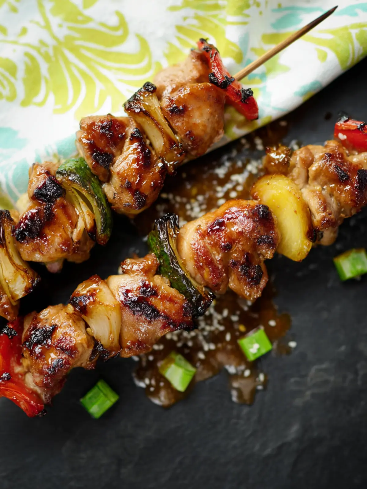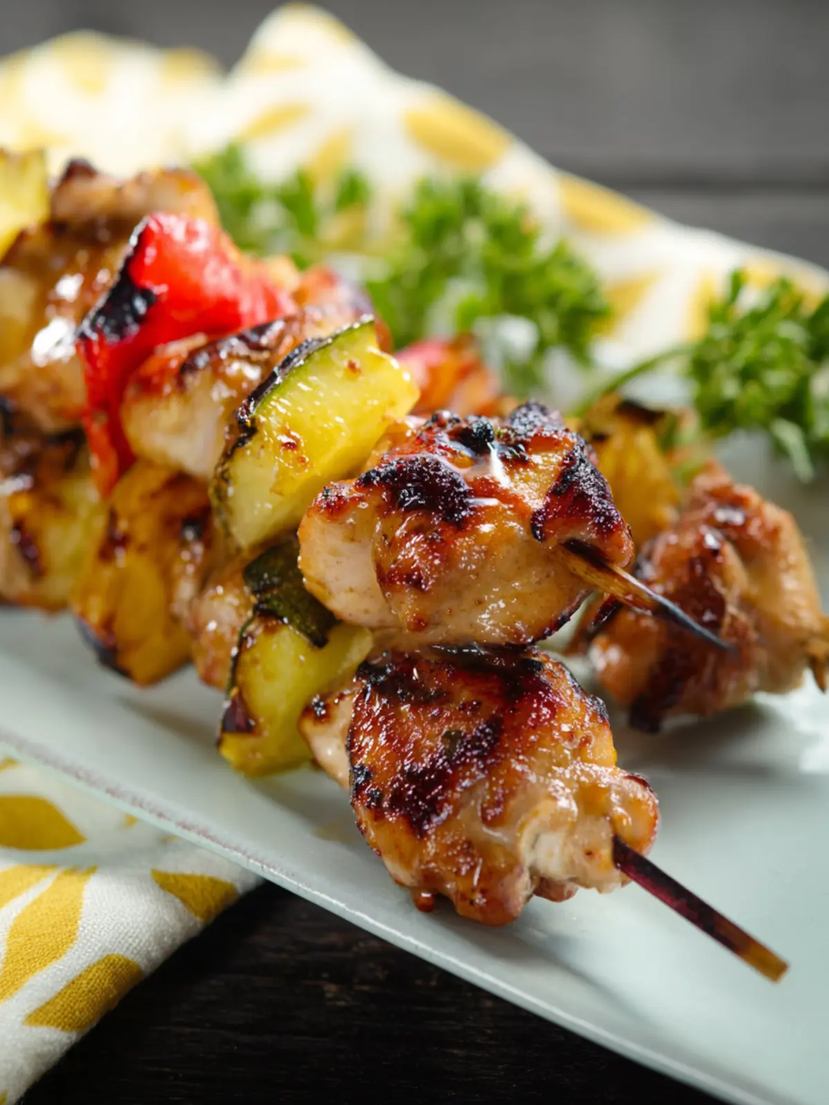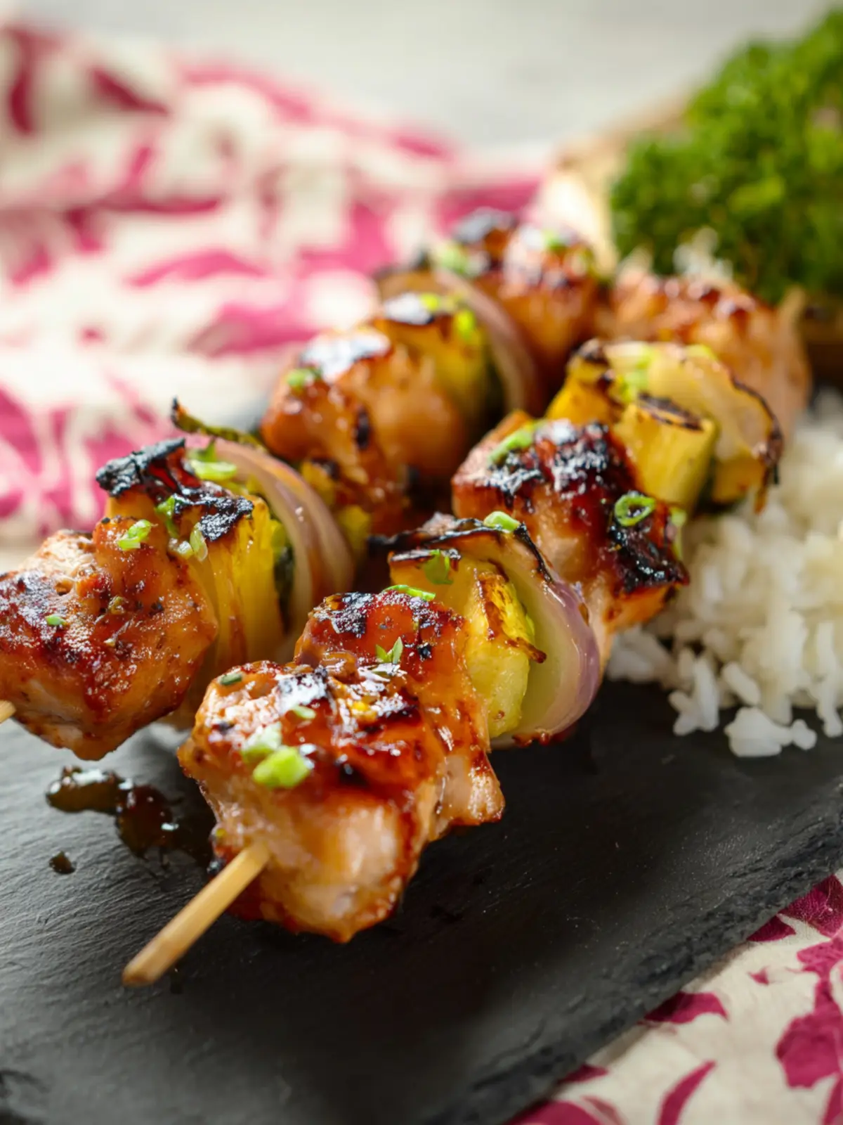 Delicious grilled chicken skewers marinated in a sweet and tangy sauce with pineapple.